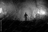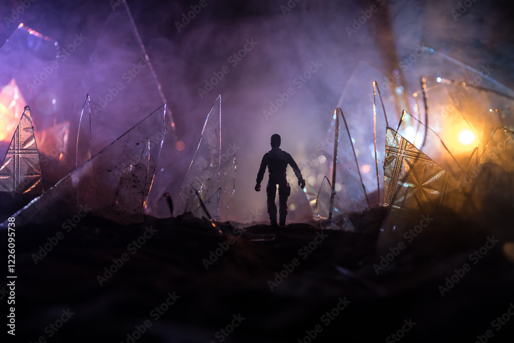 A silhouette of a person against the background of shattered glass. An abstract world made of glass shards. Surreal concept. Table top decoration.