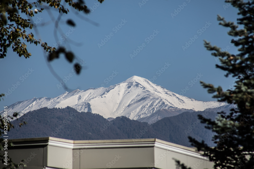 Landscape with beautiful fog in forest on hill or Trail through a mysterious winter forest with autumn leaves on the ground. Road through a winter forest. Magical atmosphere. Azerbaijan nature