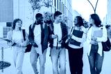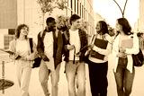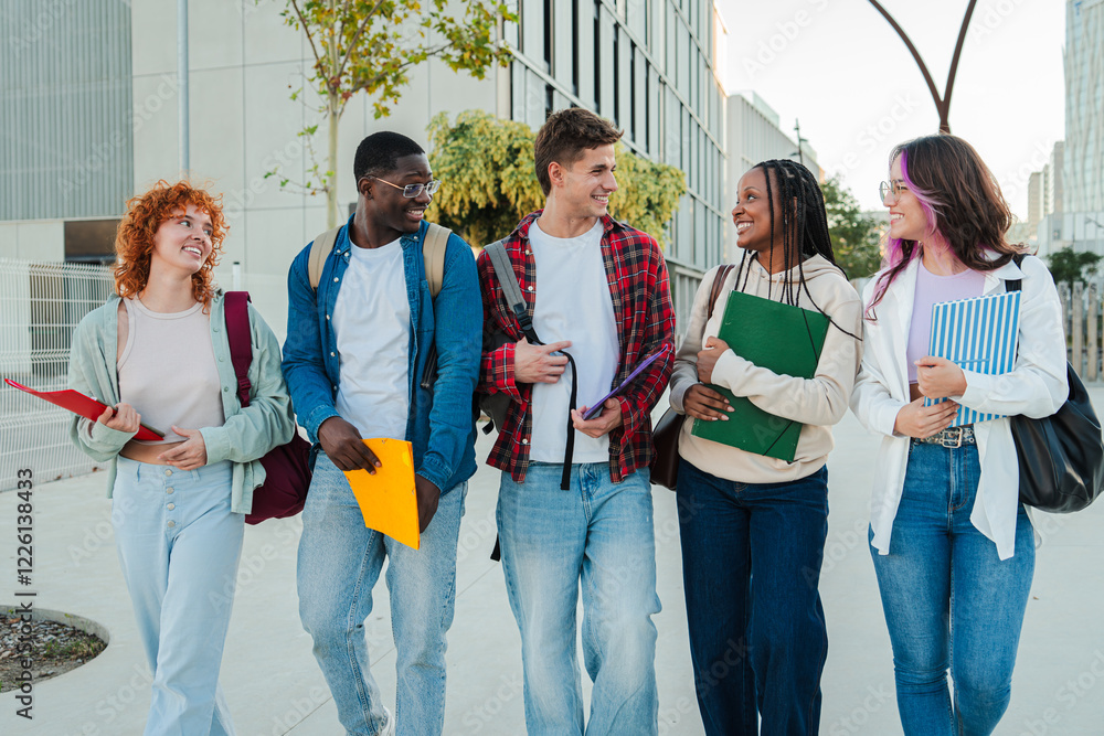 Group of Diverse Students Joyfully Walking and Talking Together While Engaging in Lively Conversation and Sharing Academic Materials at University Campus Filled with Friendship and Laughter