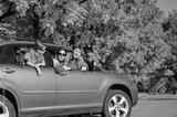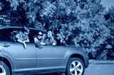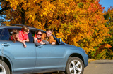 Family travel in car on autumn vacation, happy parents and kids have fun in trip, insurance concept