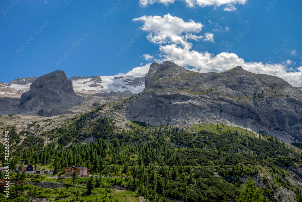 Views of Marmolada mountain massif, the highest mountain in the Dolomites group, Italy/ mountain/ snow/ peak/ rock