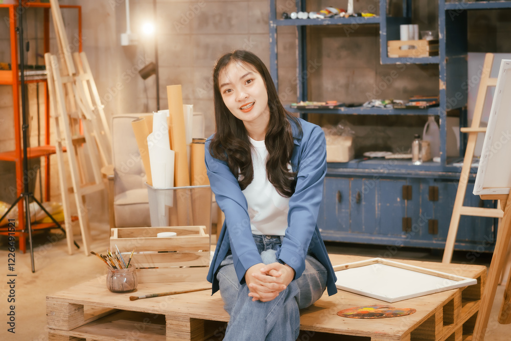 A happy Asian teenage girl painting with a brush on canvas at home, enjoying creativity and relaxation in a cozy, peaceful setting filled with artistic inspiration and vibrant colors