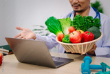 A male nutritionist sitting at a table, advising on healthy diets, promoting vegetable-based meals, supplements, weight loss, and meal planning to improve overall health and well-being