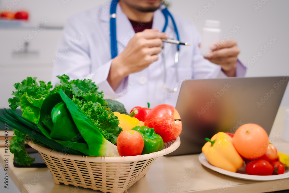A male nutritionist sitting at a table, advising on healthy diets, promoting vegetable-based meals, supplements, weight loss, and meal planning to improve overall health and well-being