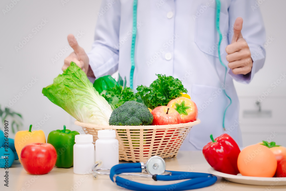 A male nutritionist sitting at a table, advising on healthy diets, promoting vegetable-based meals, supplements, weight loss, and meal planning to improve overall health and well-being
