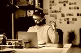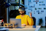 Man using virtual reality glasses and laptop in the office.