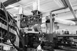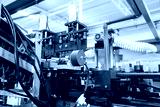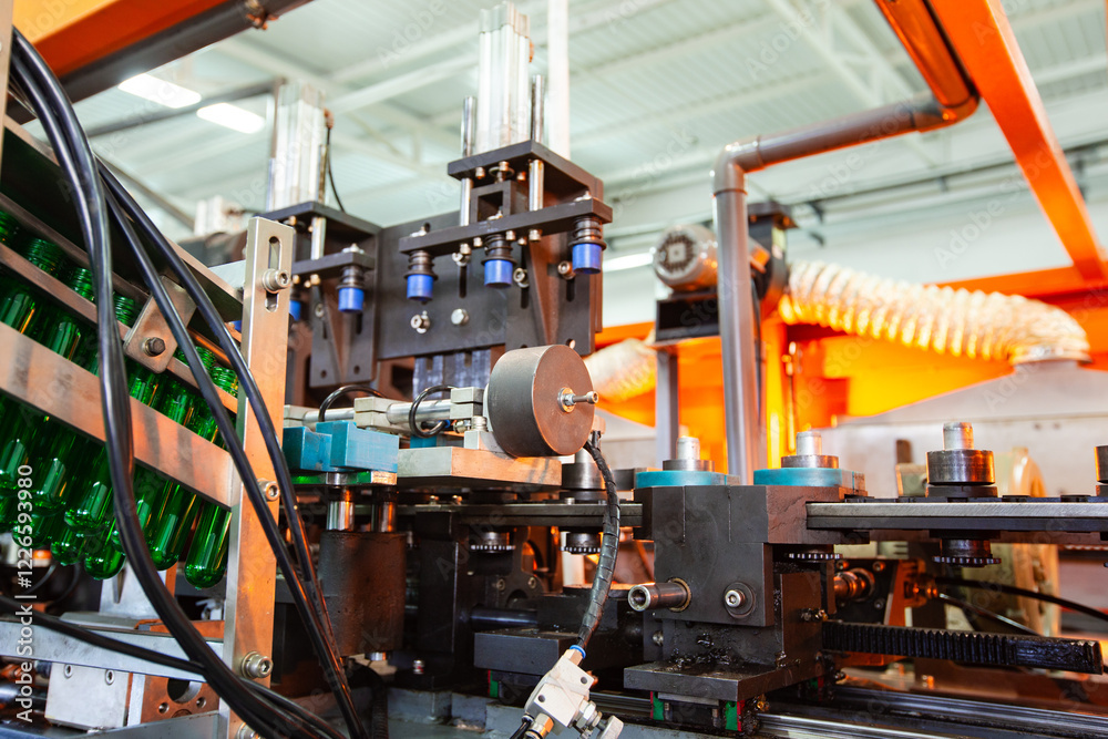 Industrial machinery operates on production line for bottle filling and capping in a modern factory setting