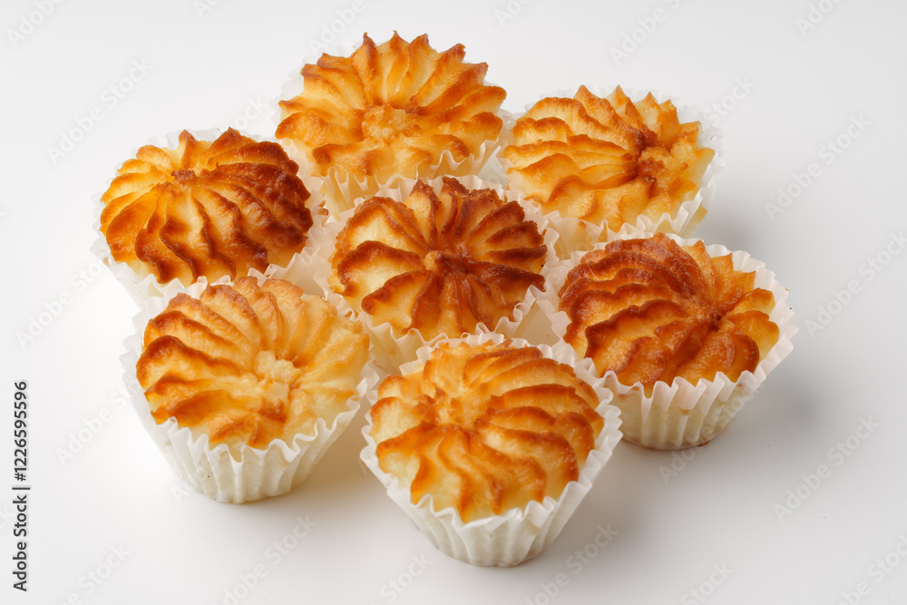 Deliciously golden baked pastries arranged beautifully on a white background for an appealing dessert display