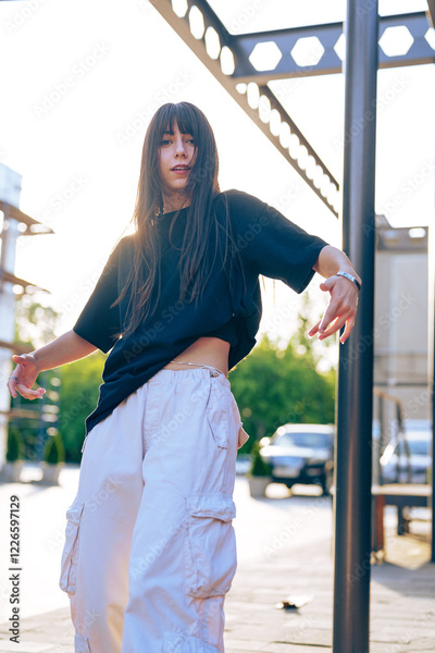 Dance performance in urban setting at sunset showcasing expressive movements and style