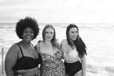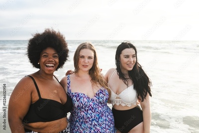 Three women in swimsuits enjoying the beach. They are smiling and standing by ocean. Women representing different ethnicities and body types. Diverse women at beach, body positivity and inclusivity.