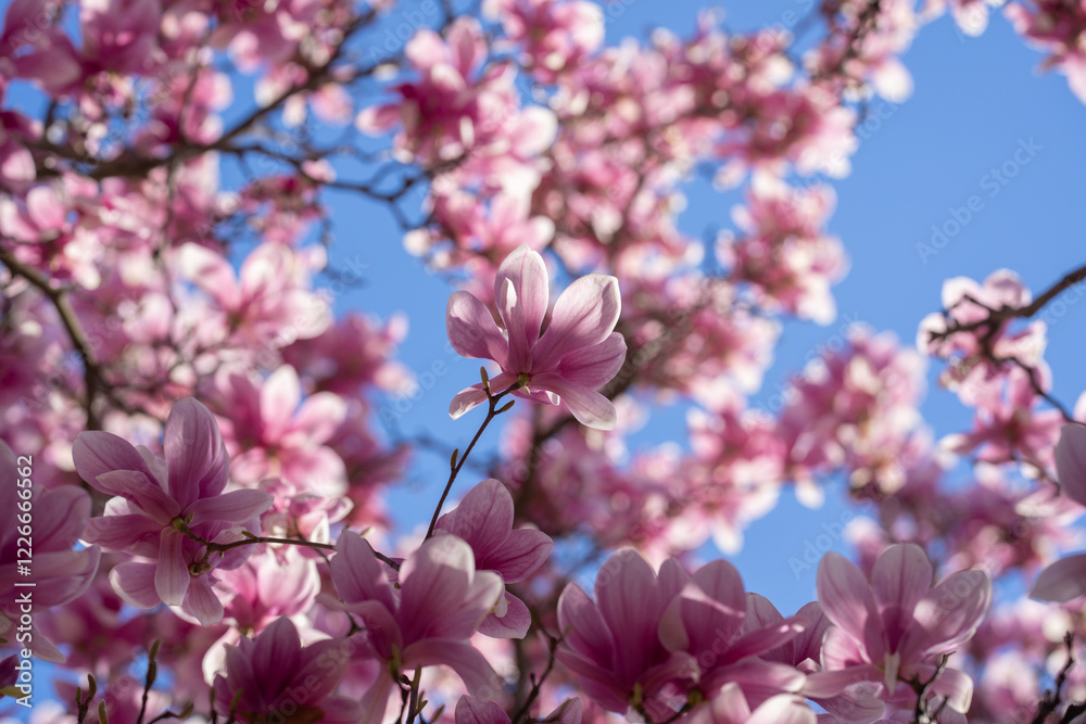 Magnolia pink blossom tree flowers, close up branch, outdoor. Blossom magnolia flower.