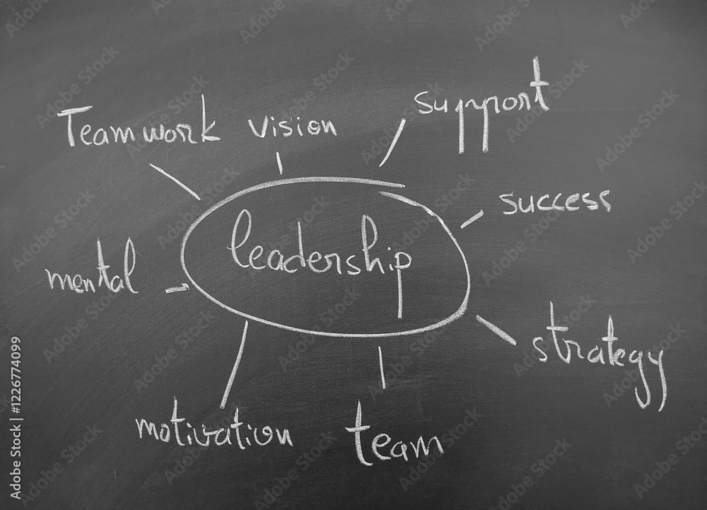 Leadership and its essential elements of teamwork, vision, motivation, support, strategy, and success visualized on a chalkboard