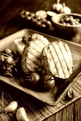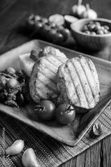 Grilled tuna steaks served with rice, tomato sauce with olives
