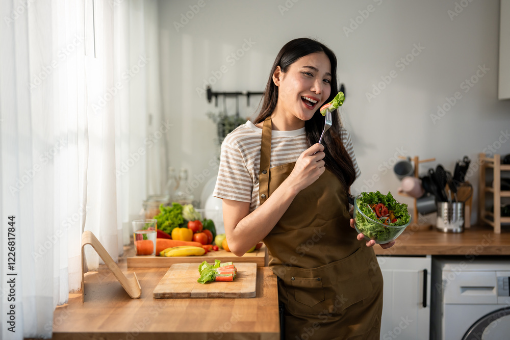 Portrait of Asian woman cooking green healthy salad in kitchen at home.