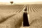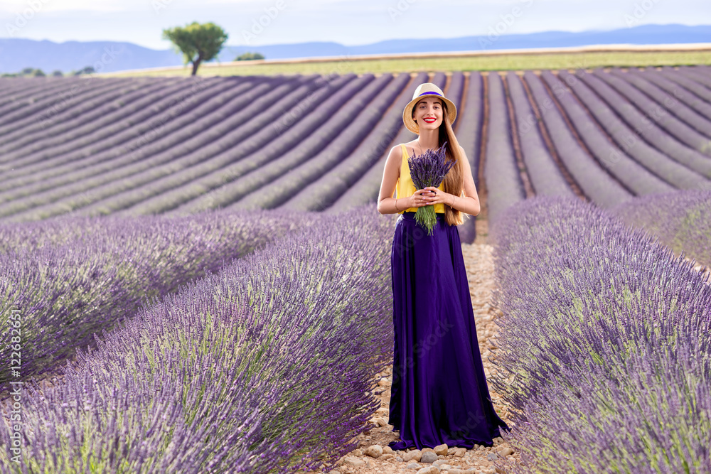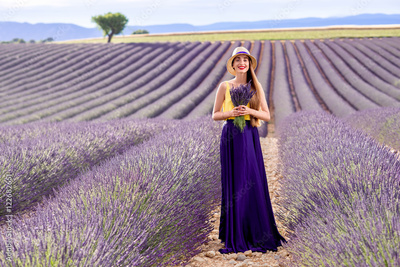 Young pretty woman in the long violet skirt standing with lavender bouquet on the lavender field in Provence in France