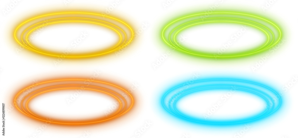 Shiny neon ellipse oval halo ring in vibrant yellow, orange, green, and blue light isolated on transparent background, creating a futuristic and energetic visual