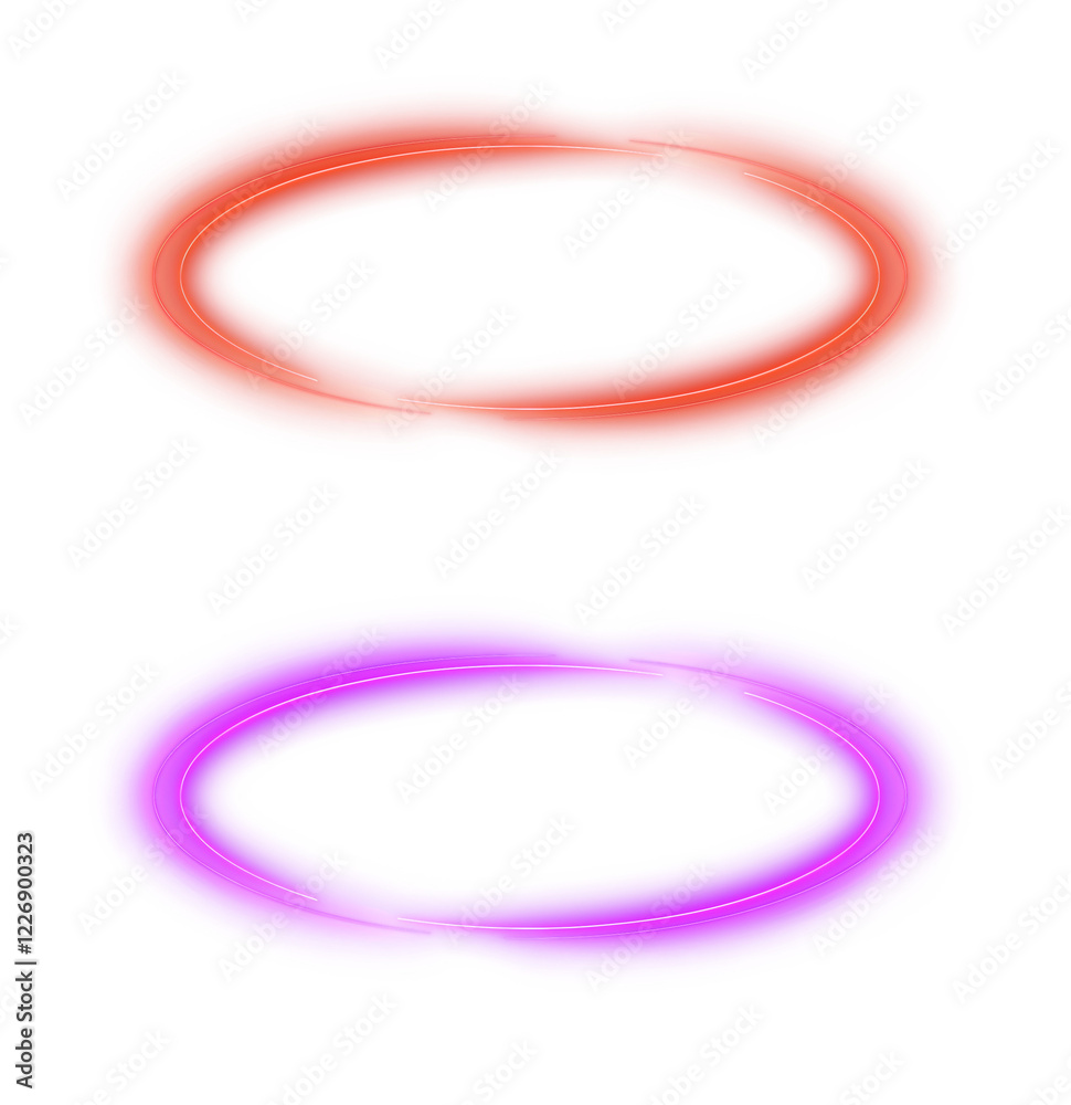 Glowing neon oval halo rings with vibrant light trails in red and purple hues, adding energy and magical effect to design and illustration