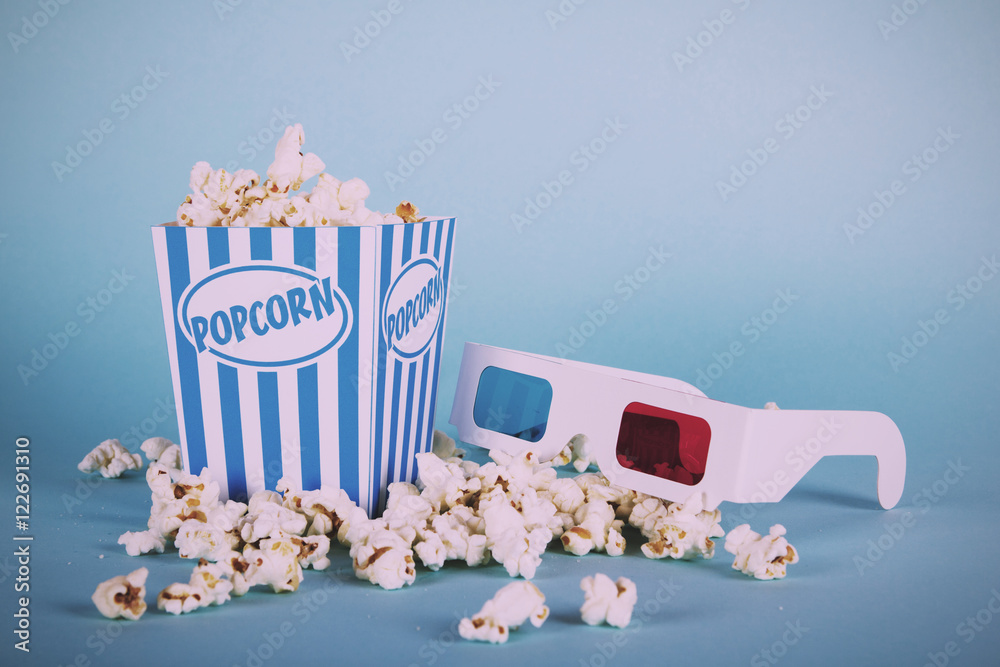 Popcorn bucket against a blue background Vintage Retro Filter.