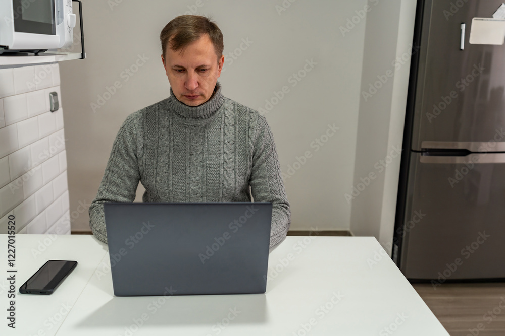 Middle aged man looking at laptop