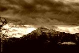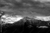 A breathtaking view of rugged mountain peaks bathed in dramatic light created by the Föhn storm. The warm, dry winds sweep across the alpine landscape, creating a unique atmospheric effect with swirli