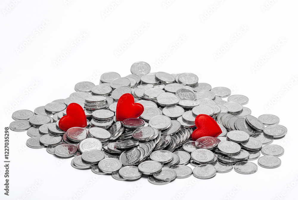 Three red hearts on silver coins, isolated on white. Idea for design. Valentine's Day screensaver.