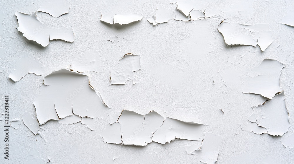 White wall with peeling paint and texture close up showing deterioration and age in an indoor environment