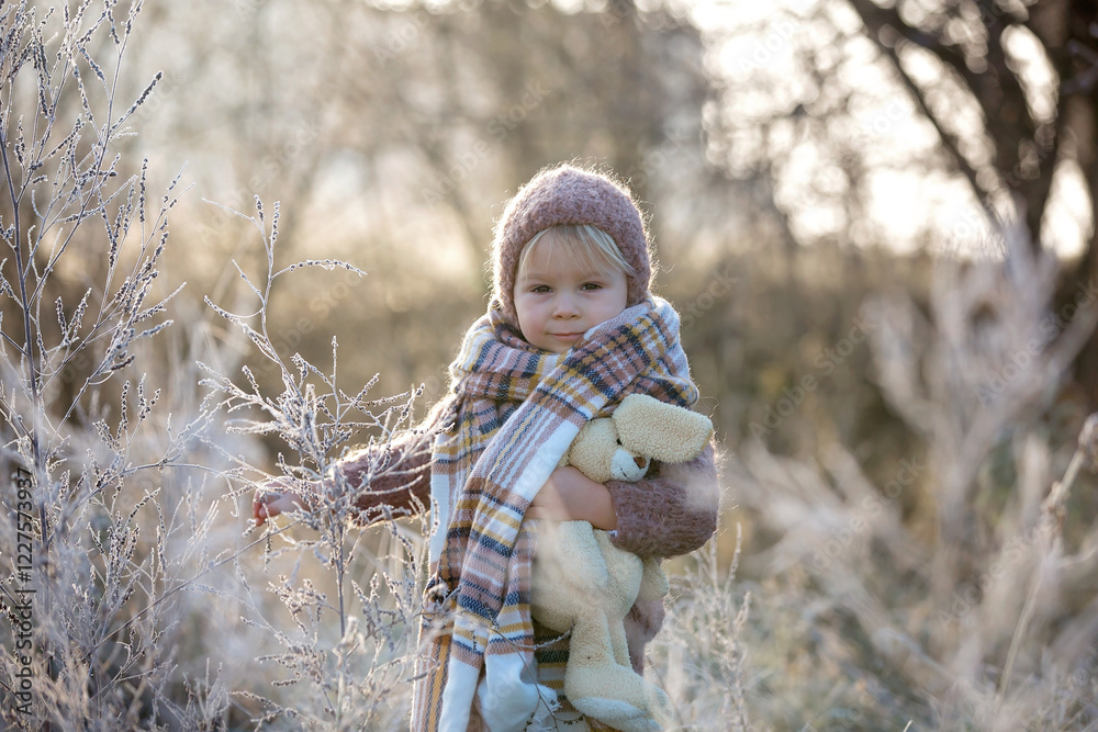 Beautiful toddler boy, dressed in knitted outfit with hat and scarf, playing in frosty morning forest