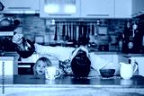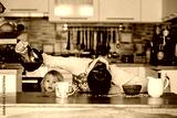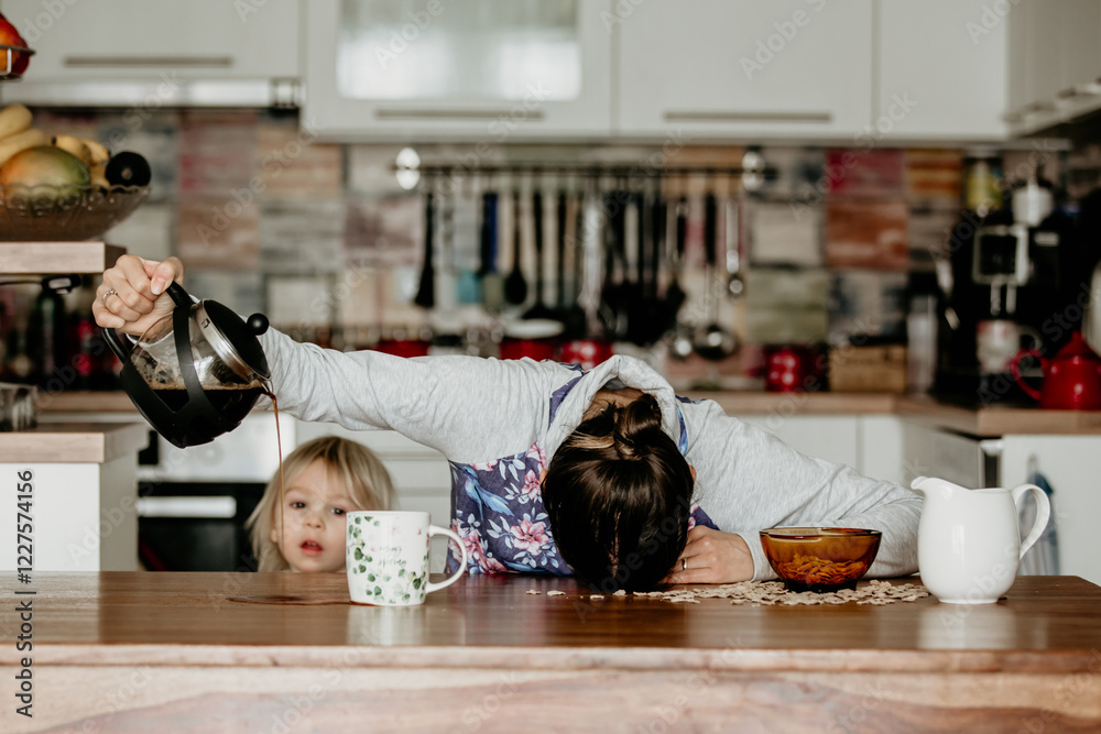 Tired mother, trying to pour coffee in the morning. Woman lying on kitchen table after sleepless night