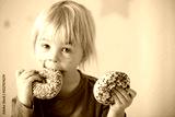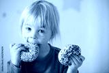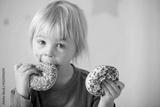 Cute sweet blonde child, playing and eating donuts