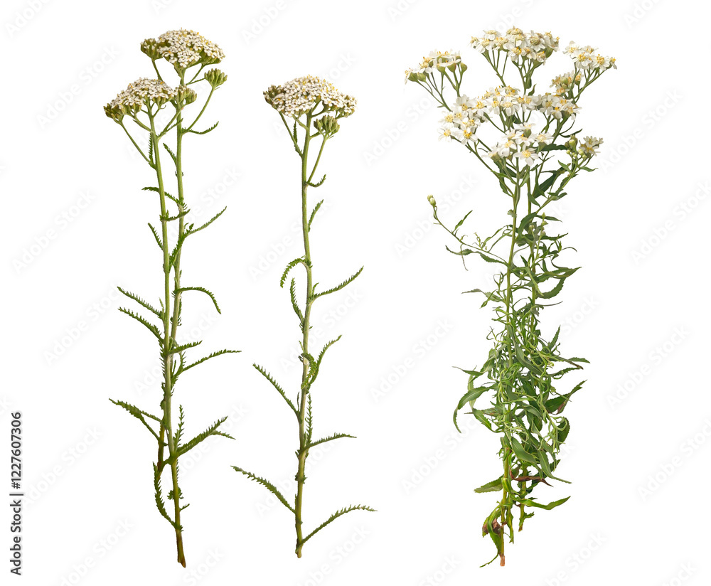 Yarrow herbal kit for medicinal uses and herbal remedies. Yarrow herb collection. Top view on white background.