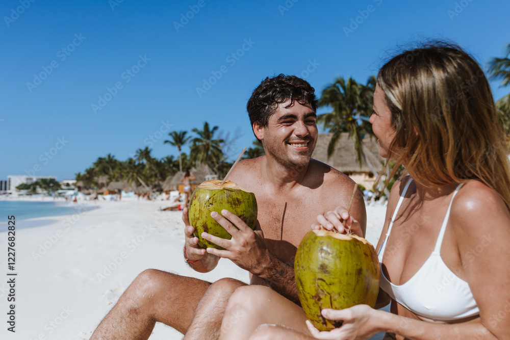 Hispanic young couple holding a coconut and having fun on caribbean beach in holidays or vacations in Mexico Latin America