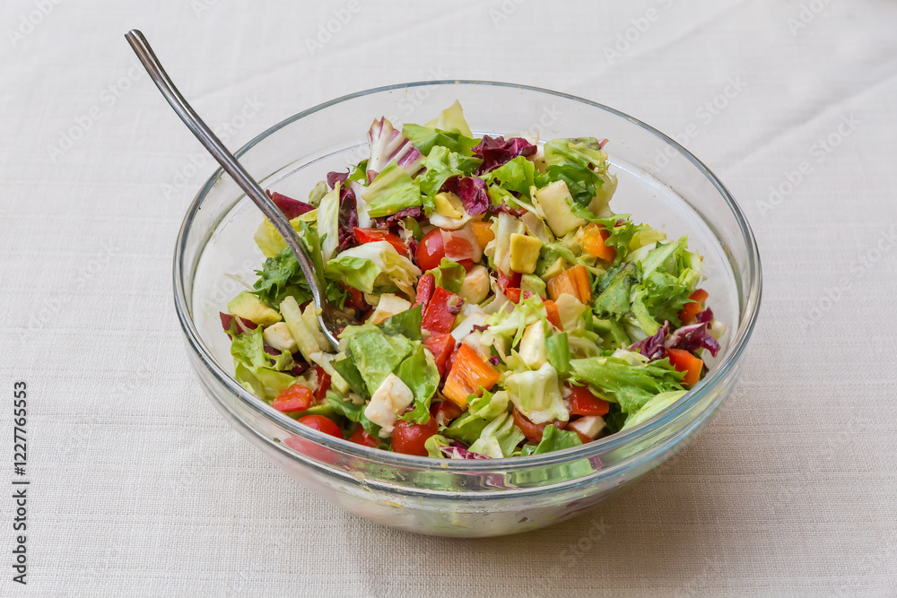Salad of mozzarella, fresh vegetables and different leaf lettuce