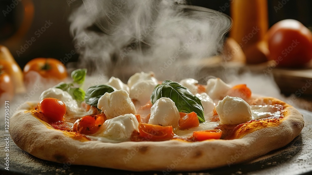 Close up Fresh baked hot Italian Pizza with steam with buffalo mozzarella and basil, tomatoes and mushrooms, pizzeria.