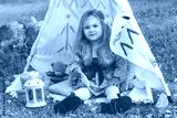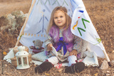 Child girl in decorative hovel on the nature