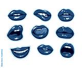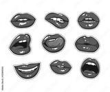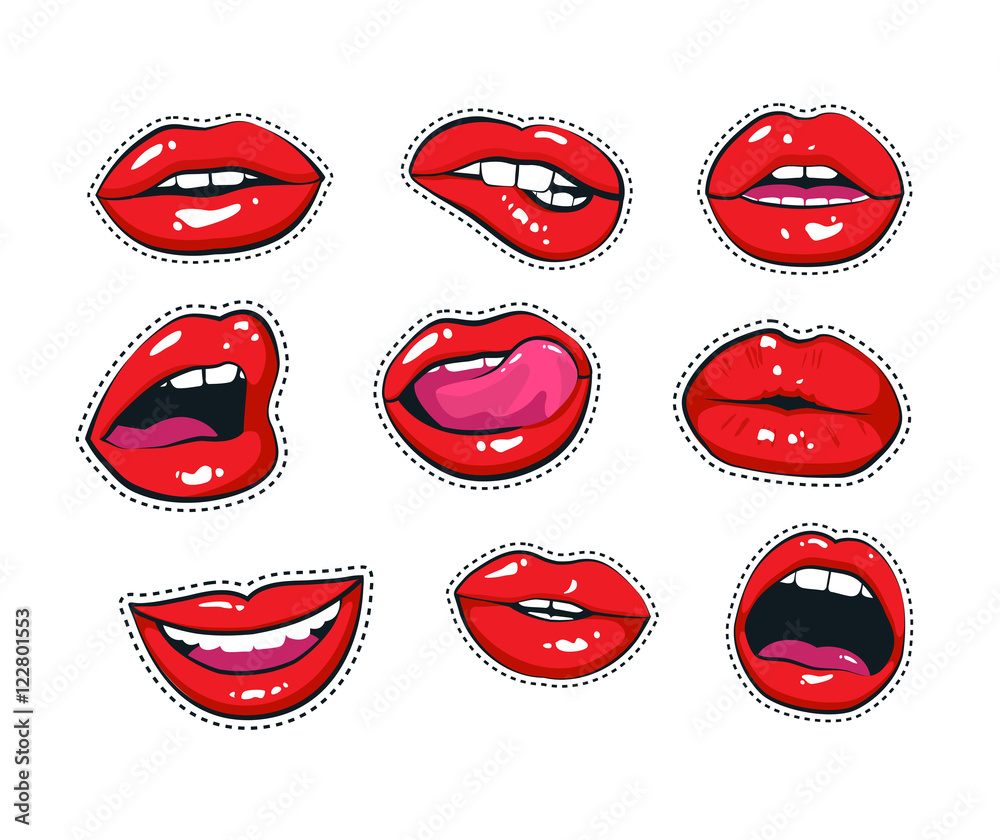 Vector stickers kit of female lips. Woman mouth with a kiss, smile, tongue and teeth isolated on background.