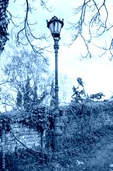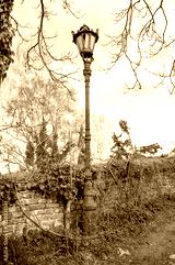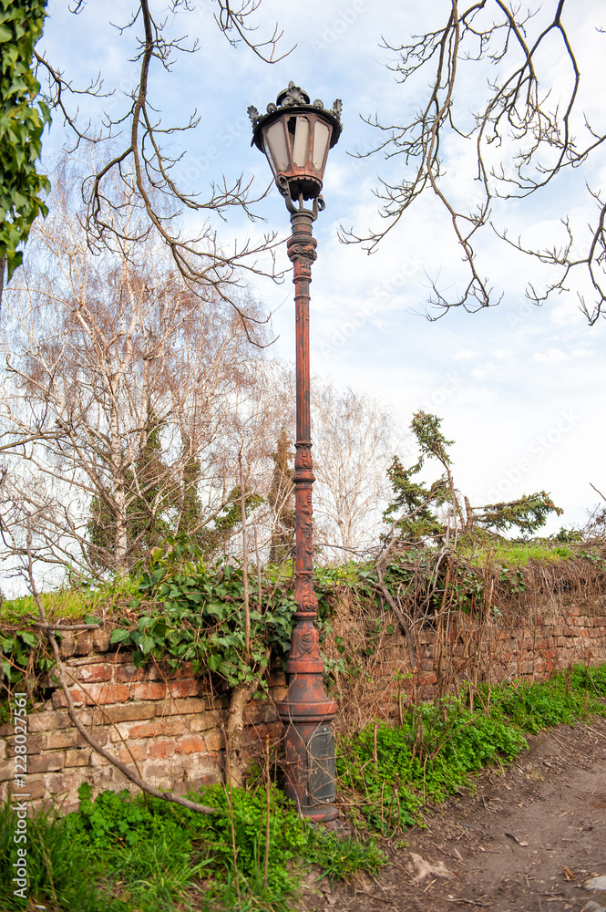 Vintage streetlight with ornate details stands beside a weathered brick wall