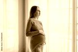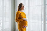 Pregnancy motherhood people expectation future. Pregnant woman with big belly standing near window at home. Girl hugging her tummy enjoying pregnancy. Maternity tenderness parenthood new life concept