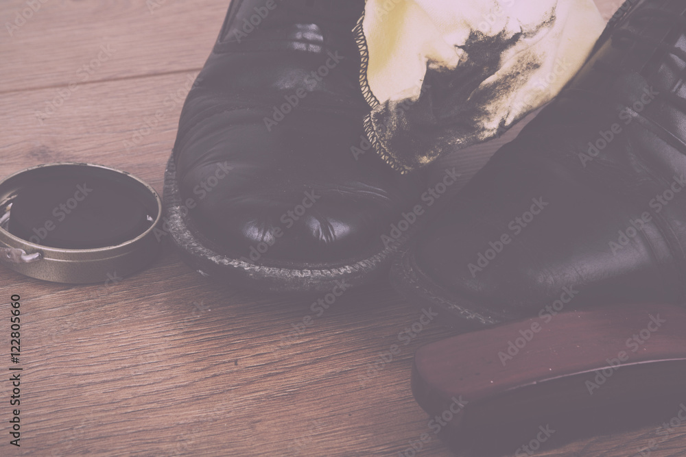 Shoes and cleaning equipment on a wooden floor Vintage Retro Fil