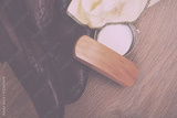 Shoes and cleaning equipment on a wooden floor Vintage Retro Fil