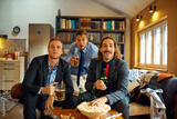 Diverse business colleagues watching sports game with beer at home after work