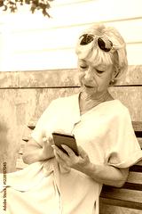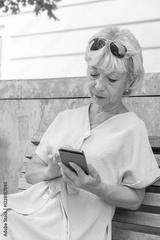 An elderly woman in a lavender dress sits on a bench and uses a smartphone.