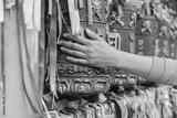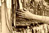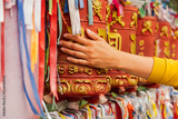 Person pilgrim female hand touching turning spinning Buddhist prayer wheel at Buddhist monastery. Prayer wheels in Buddhist stupa temple. Buddhism religion concept