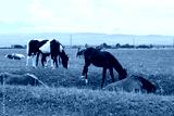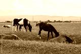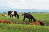 Modern animal livestock. Horses grazing in green field grassland farm countryside background. Horse in meadow chewing grass outdoor. Horse in natural eco farm. Herd of horses on green pasture