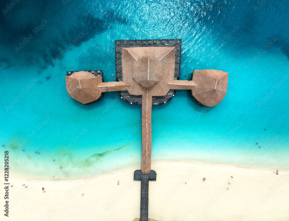Aerial view of bungalow, white sandy beach, blue ocean on summer sunny day. Restaurant on the sea. Top drone view of wooden hotel, azure water. Luxury resort in Kendwa, Zanzibar. Tropical