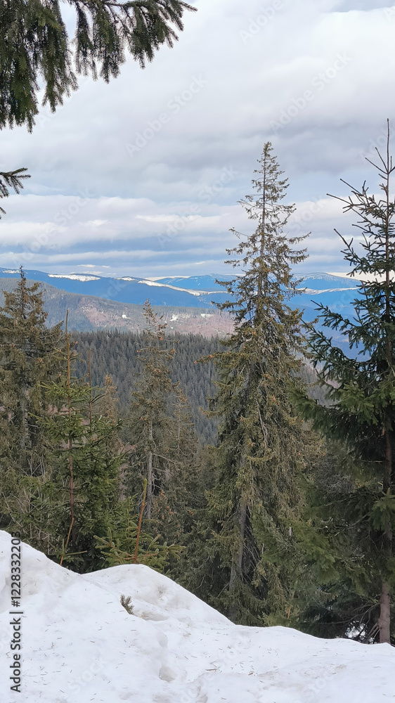 Snow Covered Mountains Evening Landscape in Carpathian Mountains Dragobrat, Vertical Photo