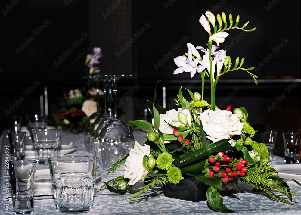 Flower composition of freesia, roses and hypericum on tables set for dining