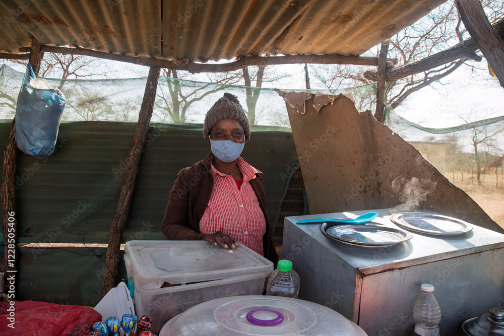 street vendor african woman in a shack selling cooked food , wearing a mask , Botswana rural area,