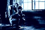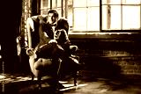 Handsome man in black formal suit with bow-tie sitting in armchair. Black and white fashion style portrait