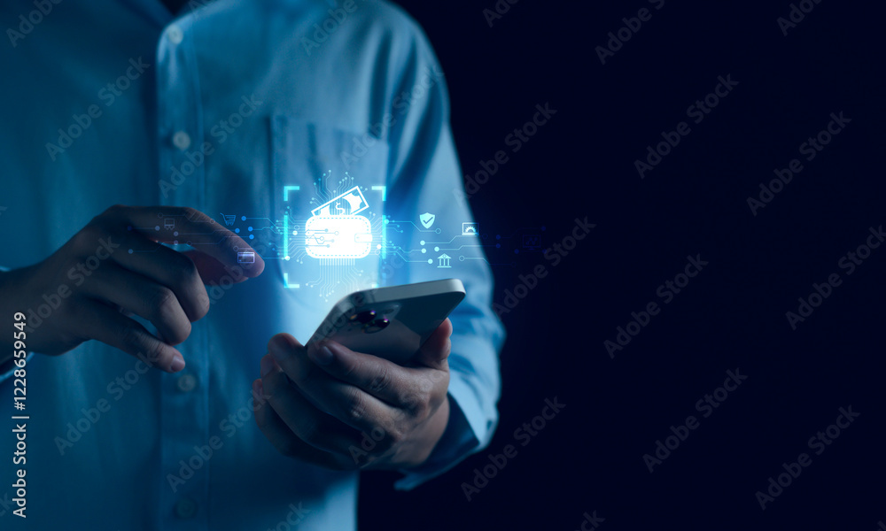 Online Payment concept, Businessman using smartphone for Digital Wallet, Transaction on Mobile banking, E-wallet on blockchain technology, transfer, credit card, financial, and global business online.