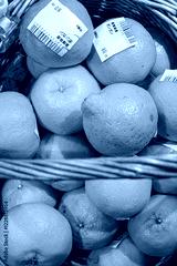 Oranges, small fruit like oranges or mandarines in a basket inside a greengrocer's shop in Tokyo in Japan.